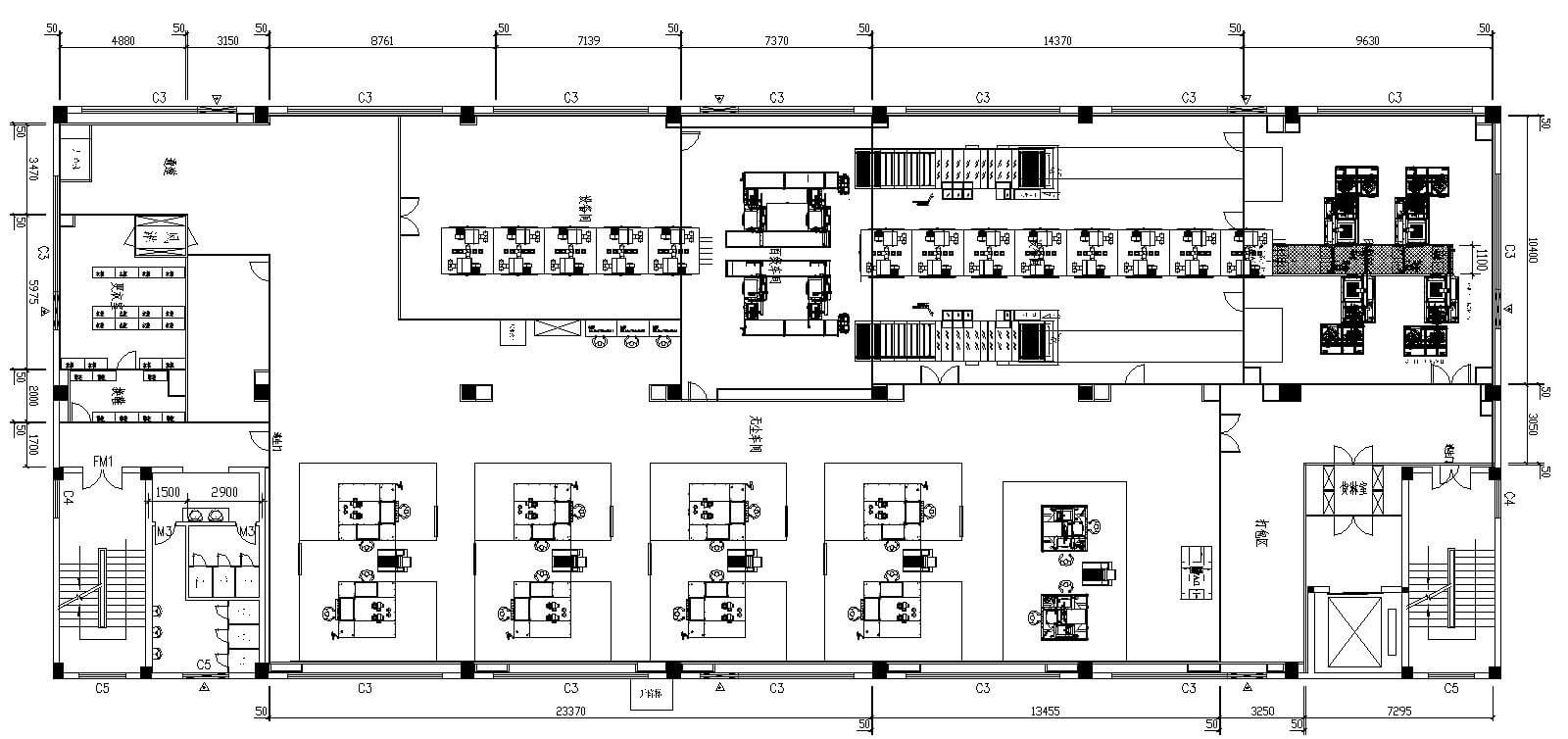 洁净室气流组织为上送下回单向流,天花上基本满布FFU送风,地板采用开孔率为18%的架空地板,部分地板有调节阀,以调节气流的流型。